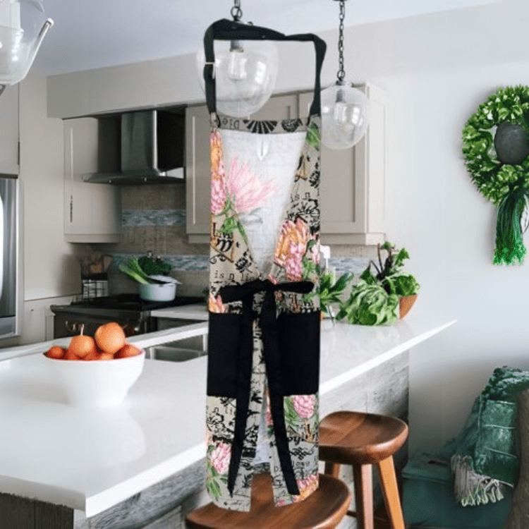This stylish floral apron features an adjustable neck strap, durable fabric, and two spacious pockets for convenience. Perfect for cooking, baking, and braai, it offers comfort, protection, and a touch of elegance.